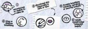 Use naloxone and call for help if someone is not breathing normally, can’t wake up, has blue or gray lips or fingernails, or is making gurgling sounds.
